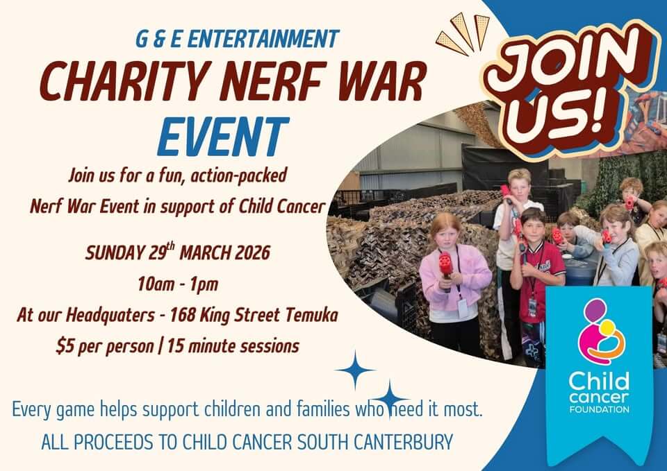 G&E Entertainment hold Charity Nerf War fundraiser at their Temuka headquarters to raise donations for Child Cancer Foundation.